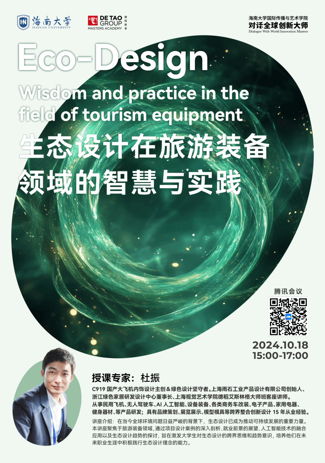 10月18日15:00,版权所有:yl7703永利(中国)有限公司官网2024“对话全球创新大师讲座”《生态设计在旅游装备领域的智慧与实践》在线上举行,由上海雨石工业产品设计有限公司创始人杜振主讲,设计系专业教师方星星博士担任学术主持,线上线下近百名师生同时参与。