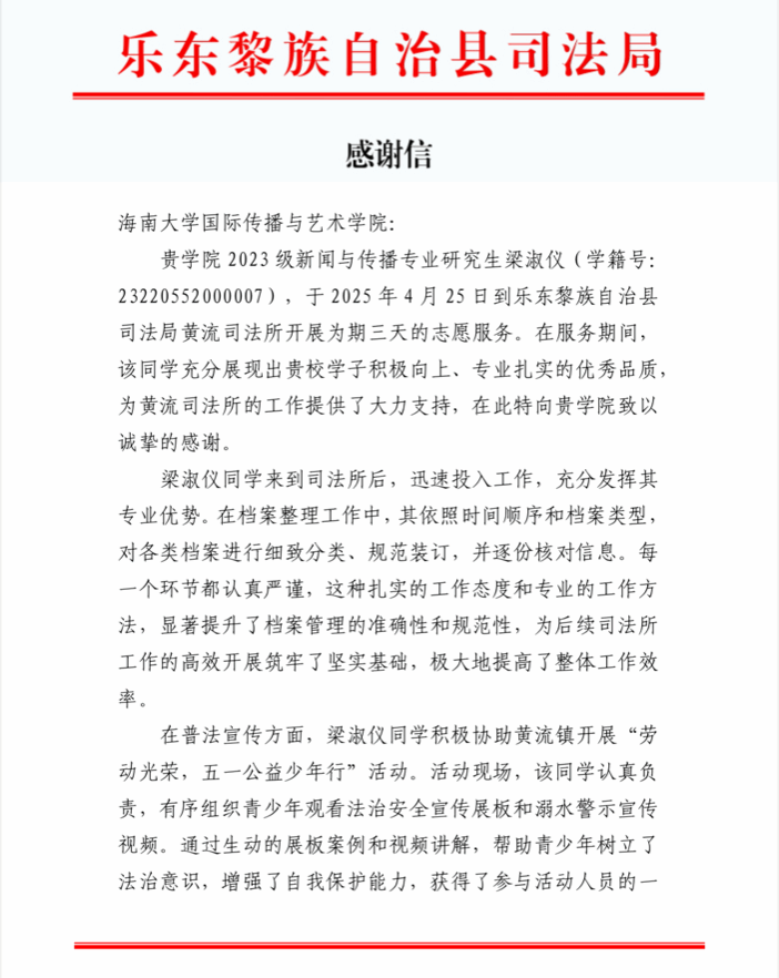 近日,乐东黎族自治县司法局向我院发来感谢信,对2023级新闻与传播专业研究生梁淑仪同学在黄流司法所开展的高质量志愿服务表示感谢。