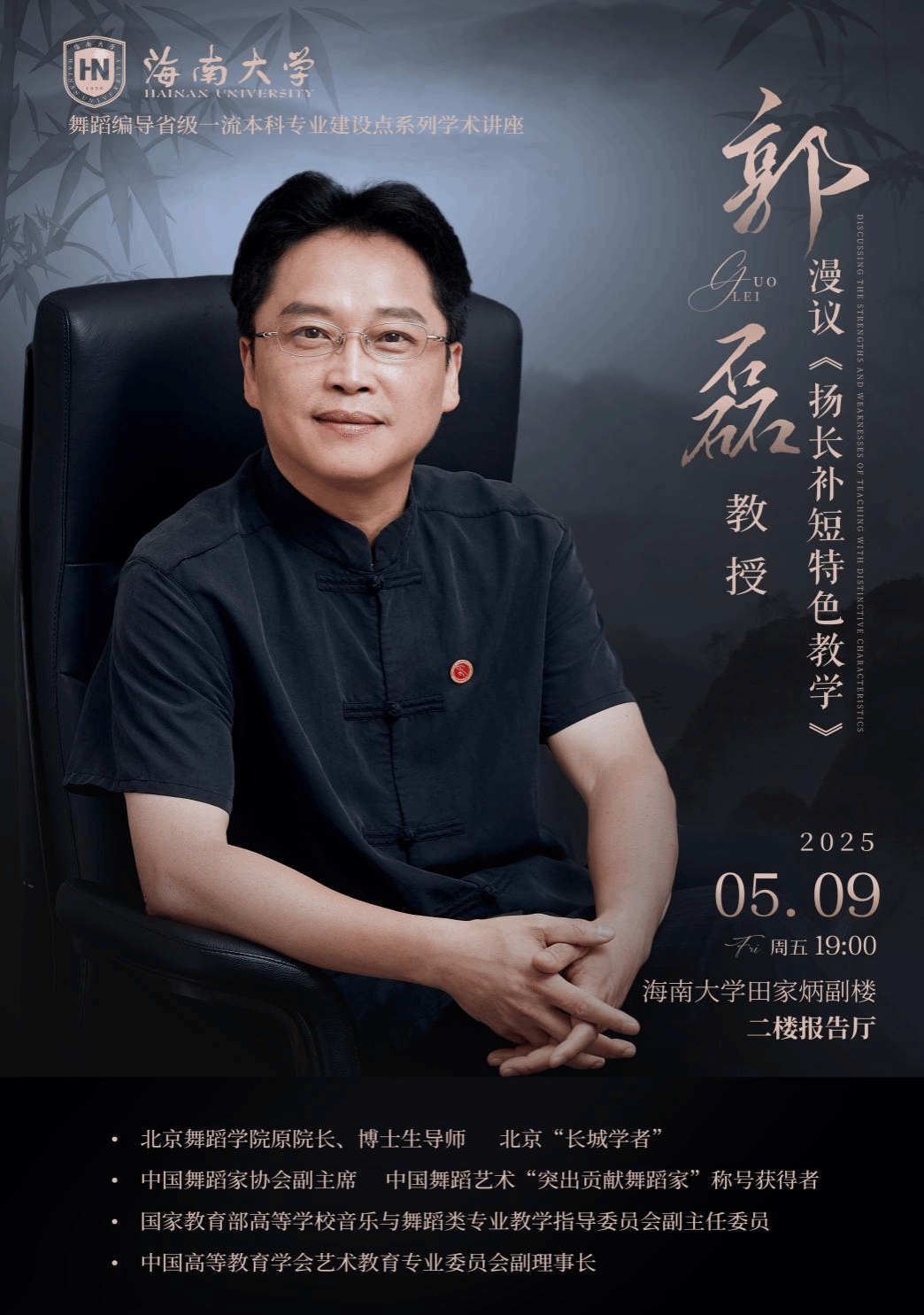 5月9日19:00,我院舞蹈系举办舞蹈编导省级一流本科专业建设点系列学术讲座——《扬长补短特色教学》,特邀北京舞蹈学院原院长、博士生导师郭磊教授主讲。活动由舞蹈系教师杨小强主持。