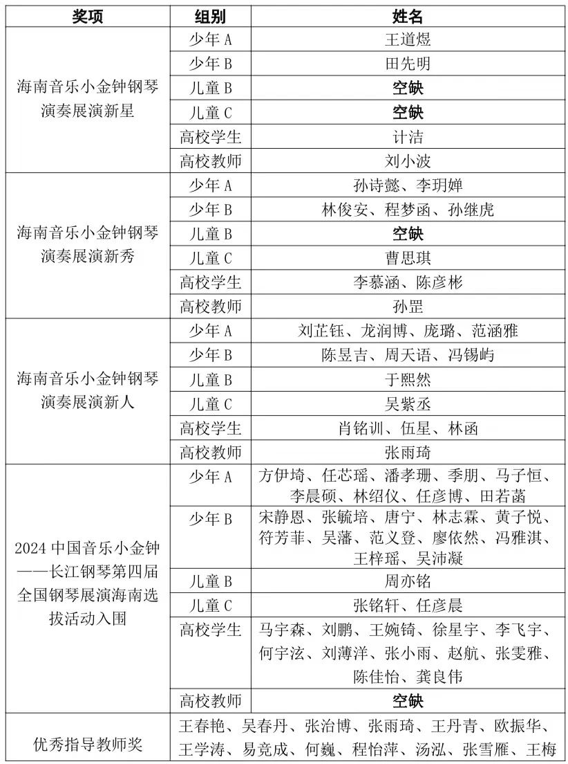2020级本科生计洁荣获海南音乐小金钟“高校学生组”钢琴演奏展演新星奖,2021级李慕涵和2023级陈彦彬荣获新秀奖,2020级伍星、2021级林函荣获新人奖,以及青年教师孙罡荣获“高校教师组”新秀奖。我院钢琴教师吴春丹、何巍、张雪雁荣获优秀指导教师奖。